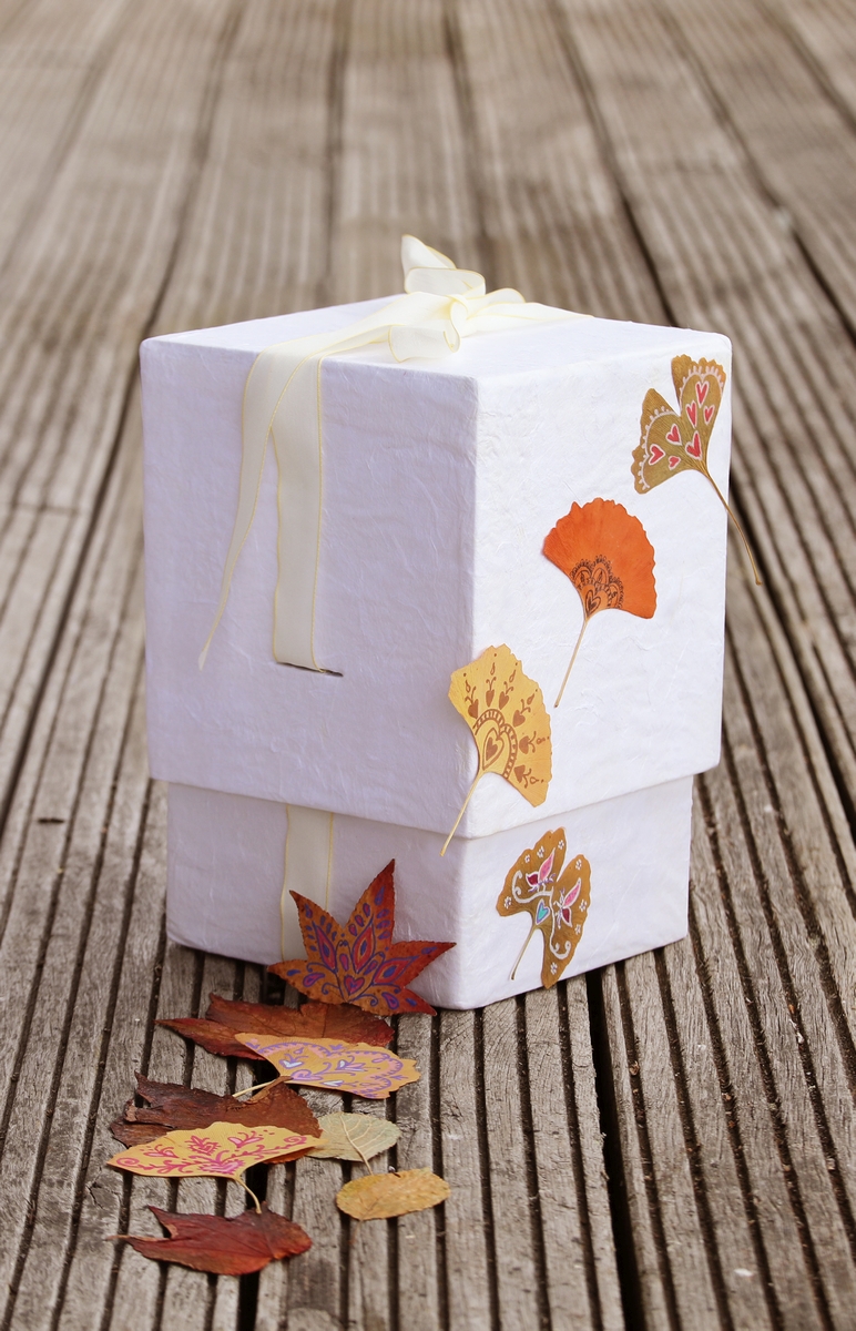 Eine Applikation mit einem gepressten vergoldeten oder mit Ornament bemaltem Baumblatt ist eine schöne Gestaltungsmöglichkeit.